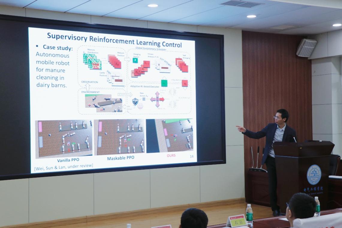 蓝江林教授提出“学习与控制理论融合”的创新路径,分享了数据驱动模型预测控制、两级强化学习模型预测控制等核心技术。针对混合车辆队列控制难题,数据驱动模型预测控制可有效应对人类驾驶行为的不确定性,相较于传统自适应巡航控制系统(ACC),能有效规避碰撞风险;在环岛交互驾驶的复杂场景中,两级强化学习模型预测控制可将碰撞率降至1%-2%,显著优于主流算法;面向奶牛场清粪的实际作业场景,其团队研发的粪便清洁机器人监督强化学习方案,通过全局进化调度与自适应执行器的协同配合,实现了安全高效自主作业。